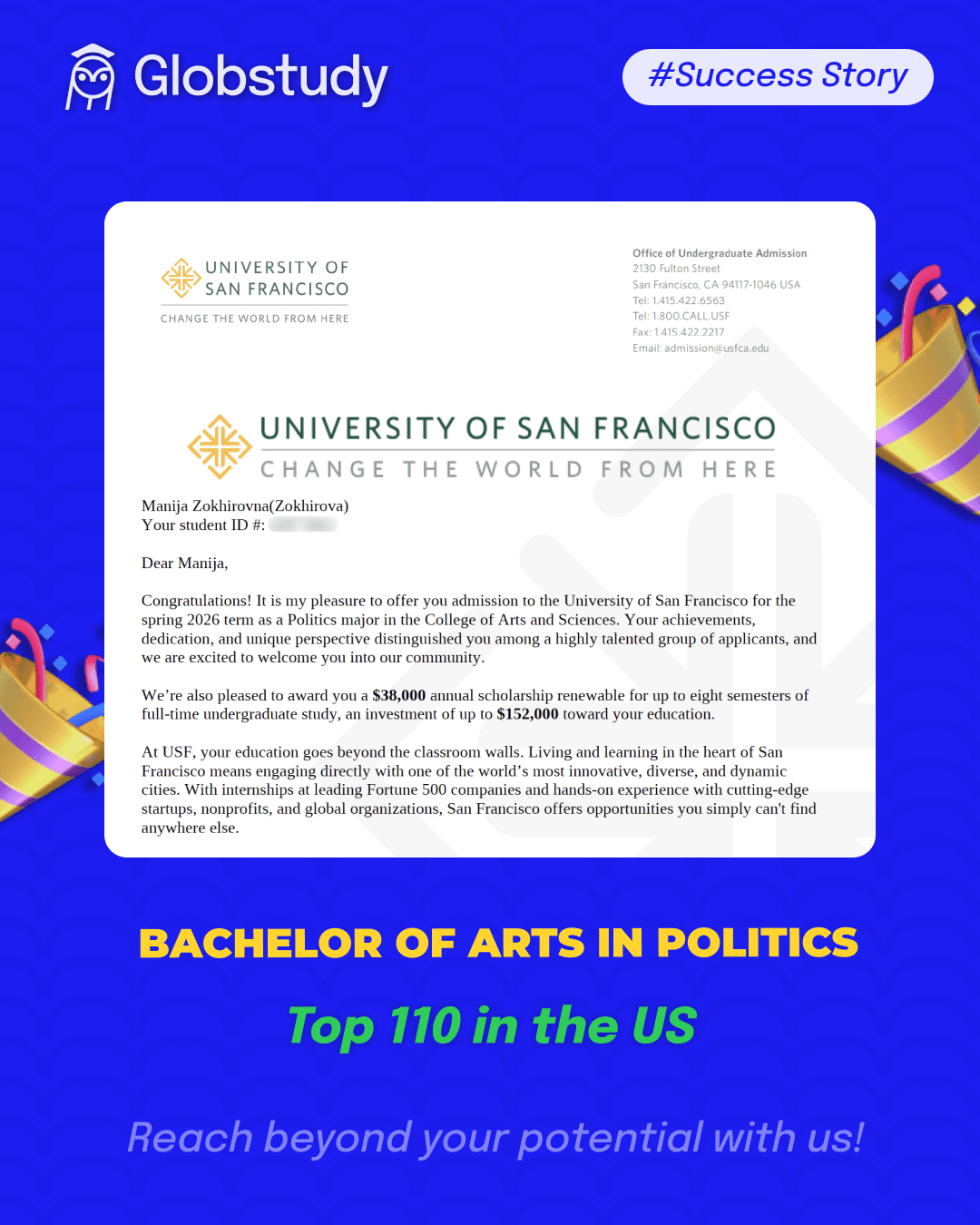 Manija’s decision to enroll at University of San Francisco (USF) opens the door to an academic environment that strongly aligns with her interests in politics, governance, and social impact. USF is widely recognized for its values-driven education, emphasis on ethics, and commitment to social justice.